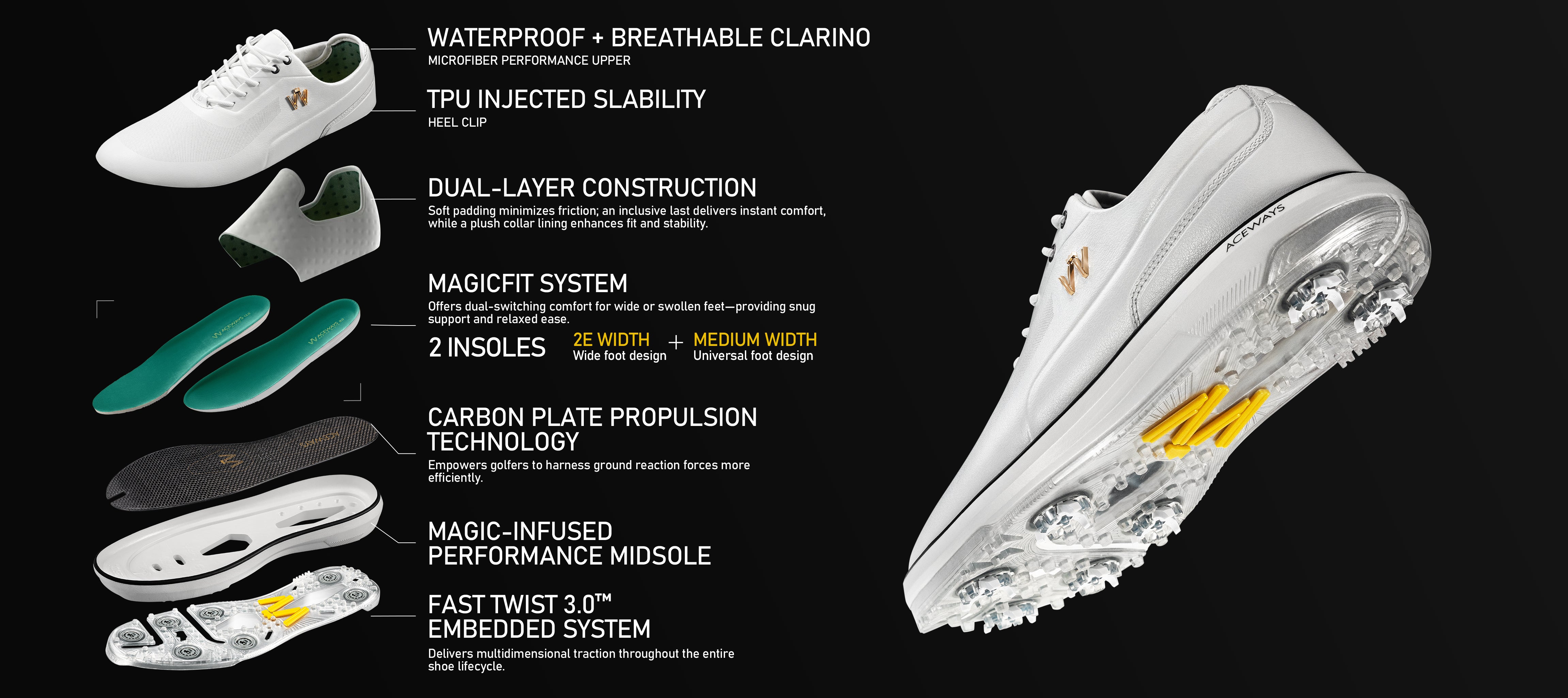 TPU Outsole, with SoftSpikes FTS 3.0 insert system, delivers traction in three dimensions for the life of the shoe. - MagicFit (two-piece) System Footbed delivers lightweight responsive cushioning for the life of the shoe. Offers dual-switching comfort for wide or swollen feet—Play 18 holes with ease—no swollen feet.
